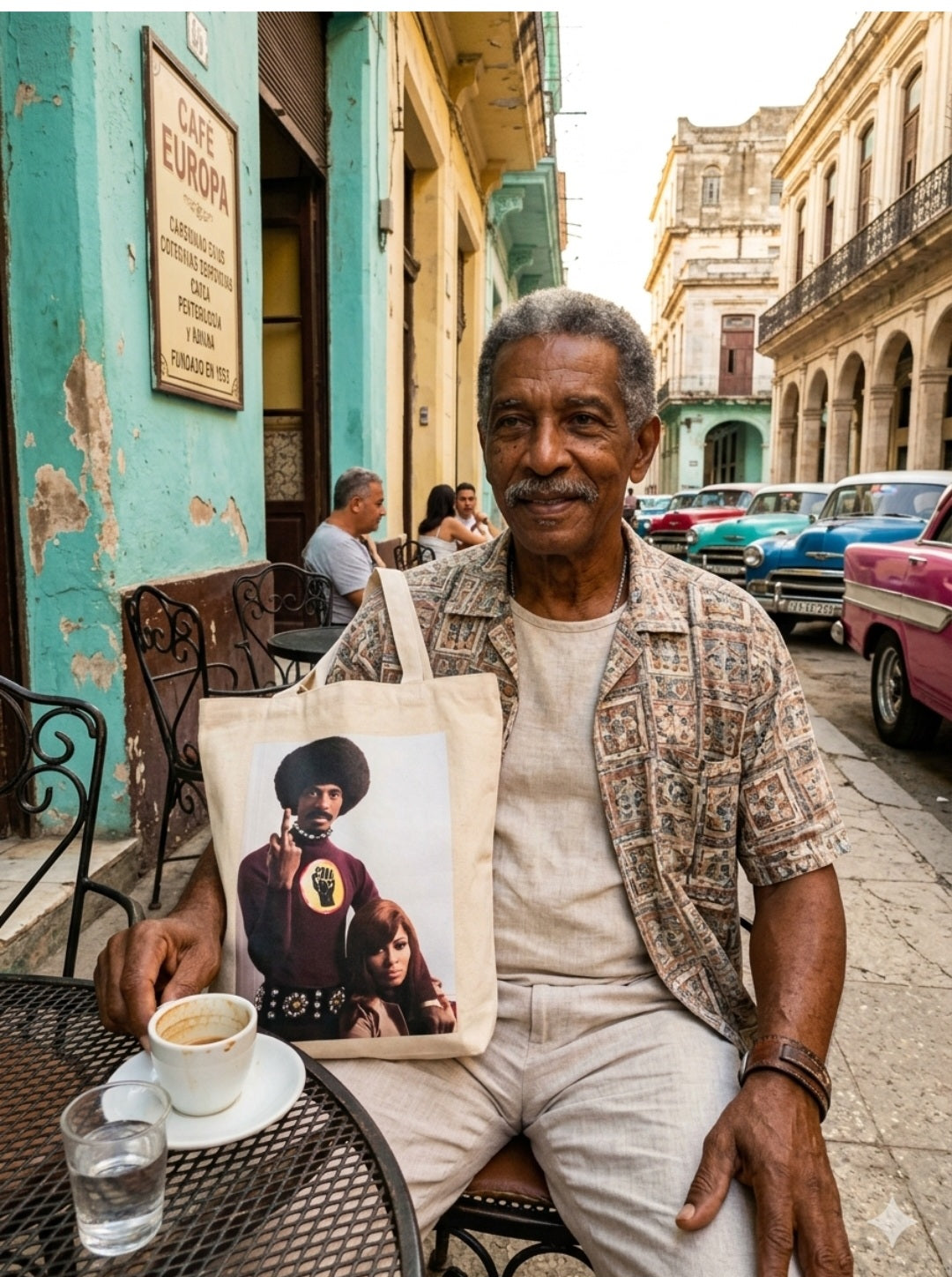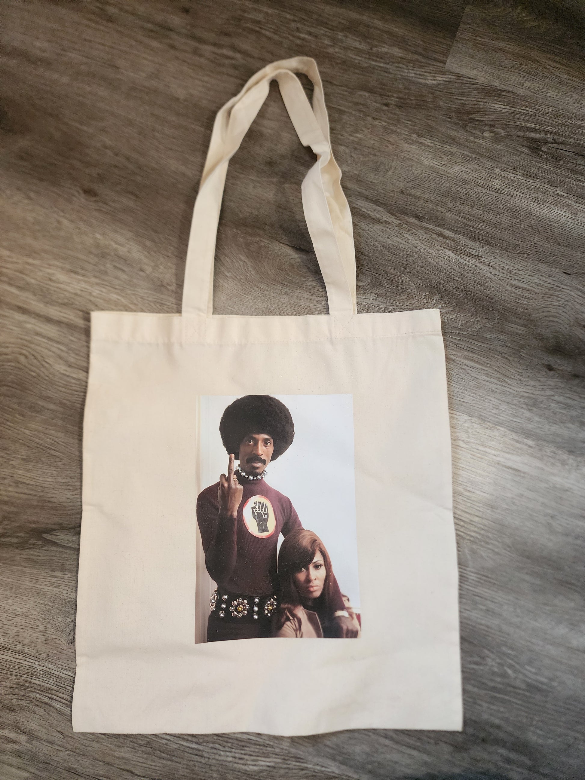 Ike Turner: He is seen with a large afro, wearing a maroon turtleneck sweater featuring a prominent Black Power fist emblem on the chest. He also wears a distinctive pearl-and-gold beaded choker and a matching heavily embellished "concho" style belt. In the image, he is making a defiant gesture with his middle finger raised.