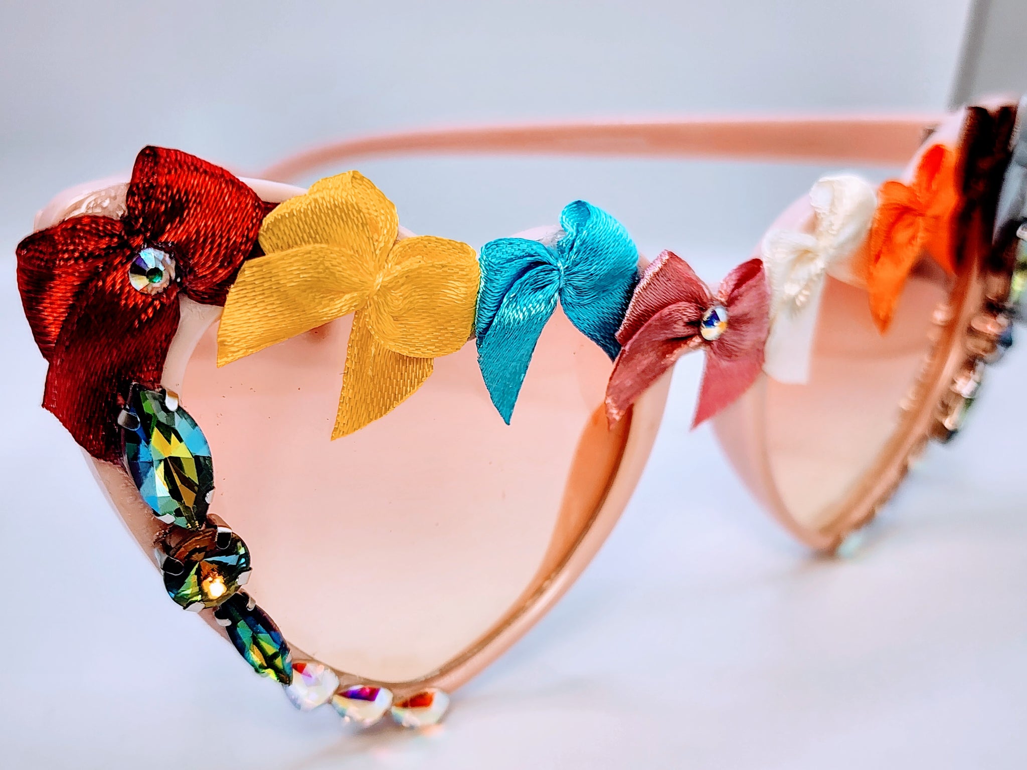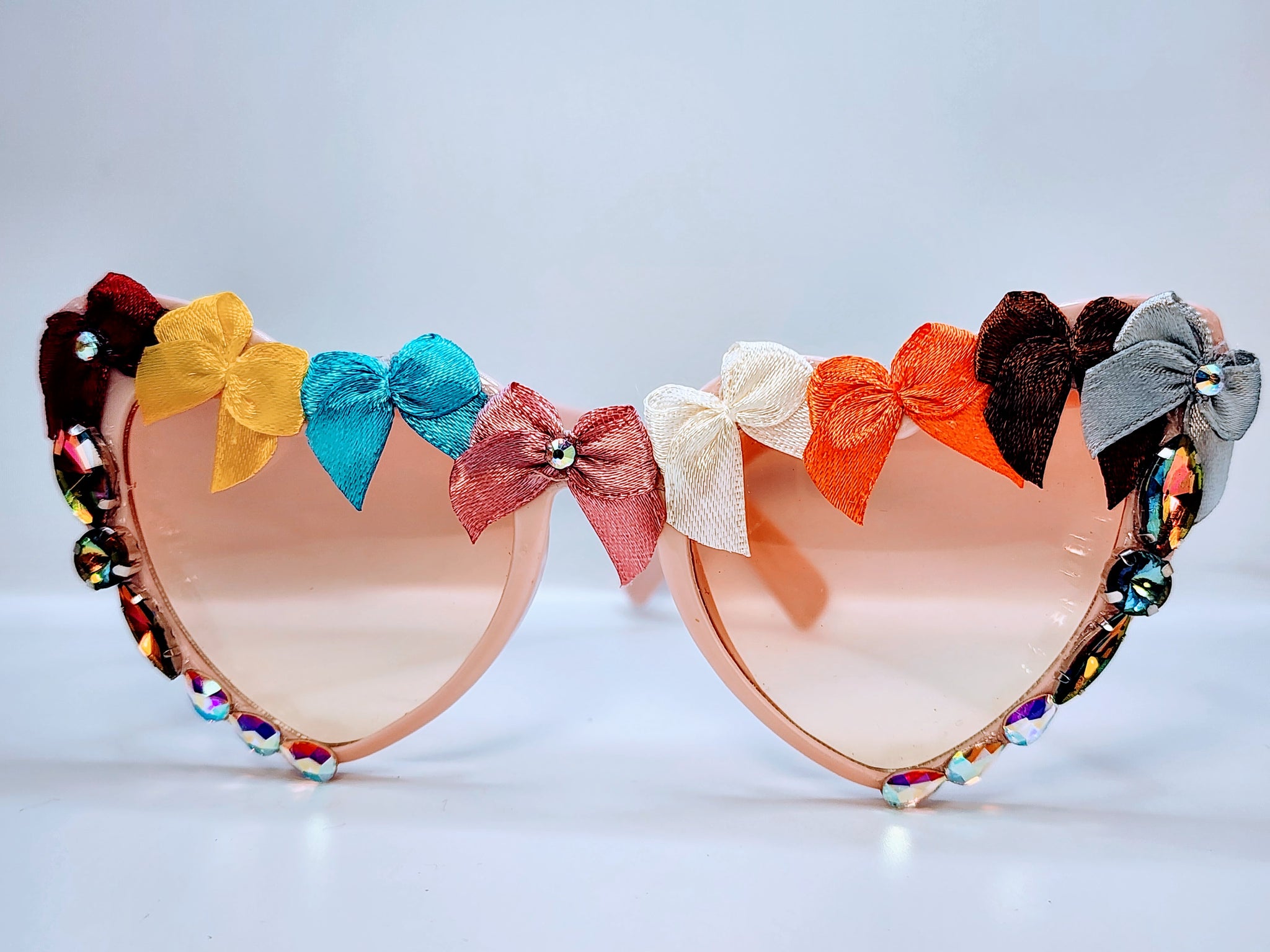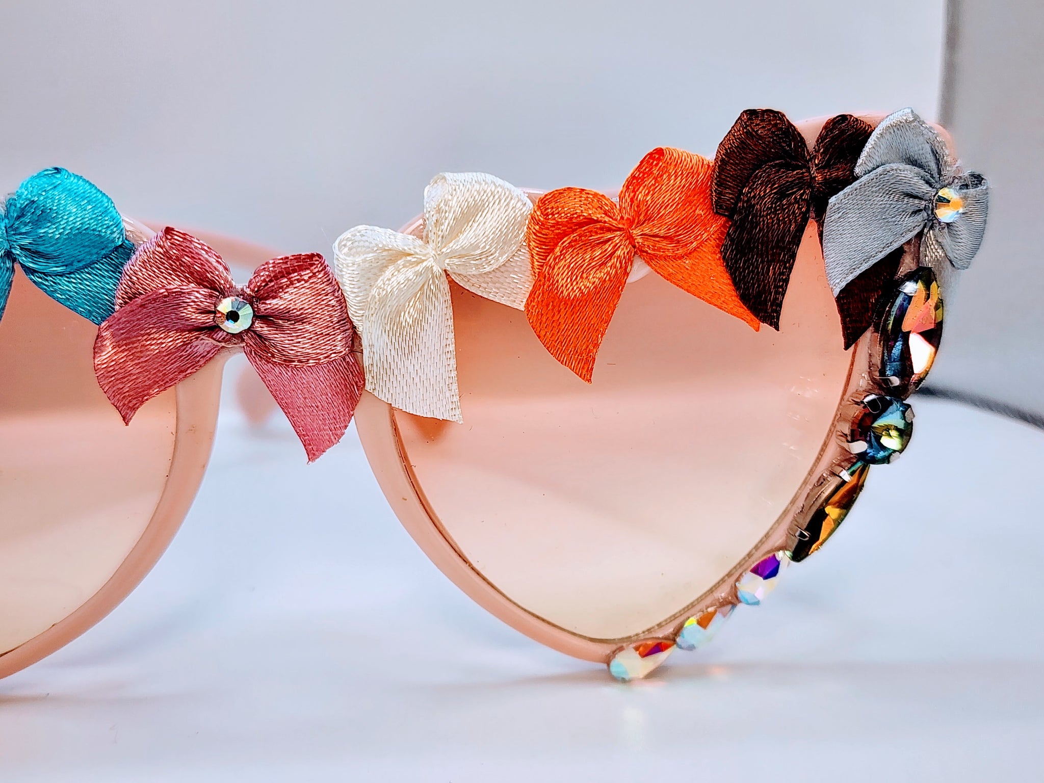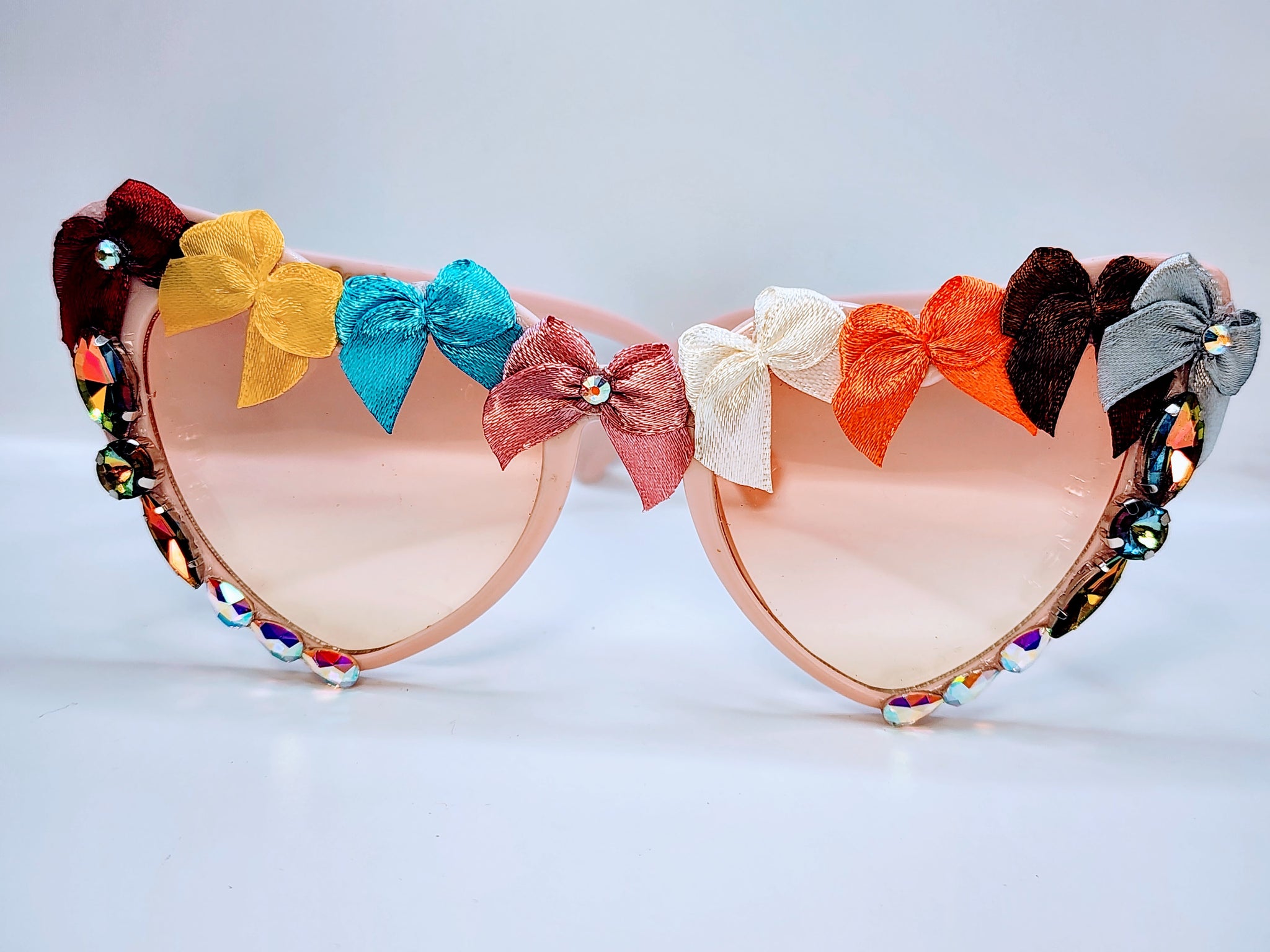 Catch Much Attention in these sweetheart 💗pink -heart-shaped glasses, delicately adorned with handcrafted satin ribbons strategically placed around the frame.
