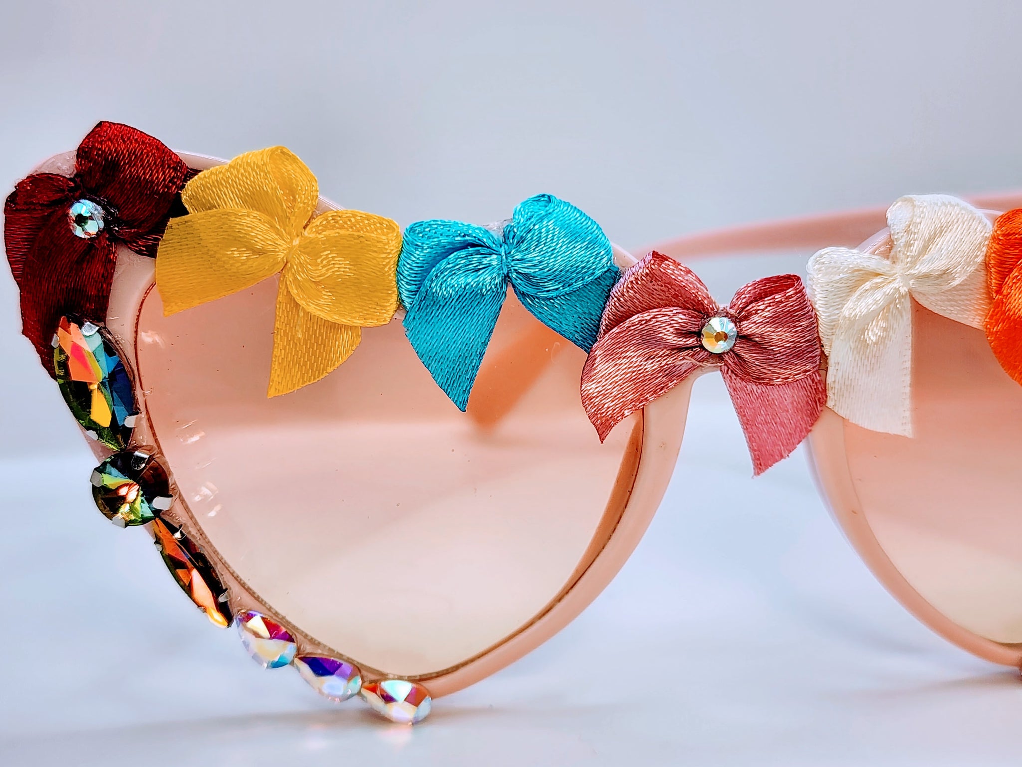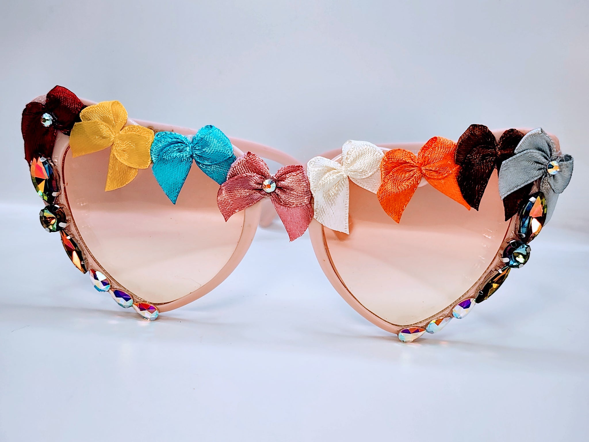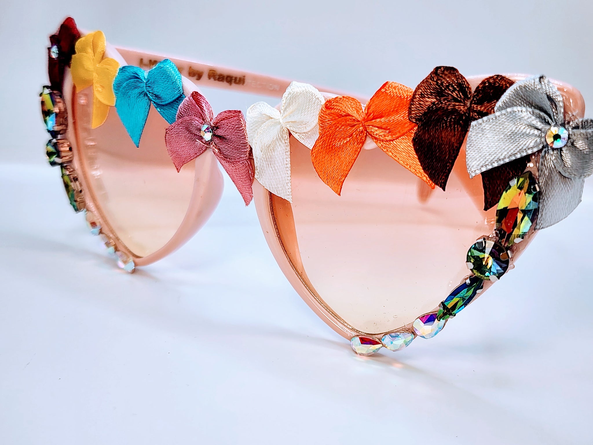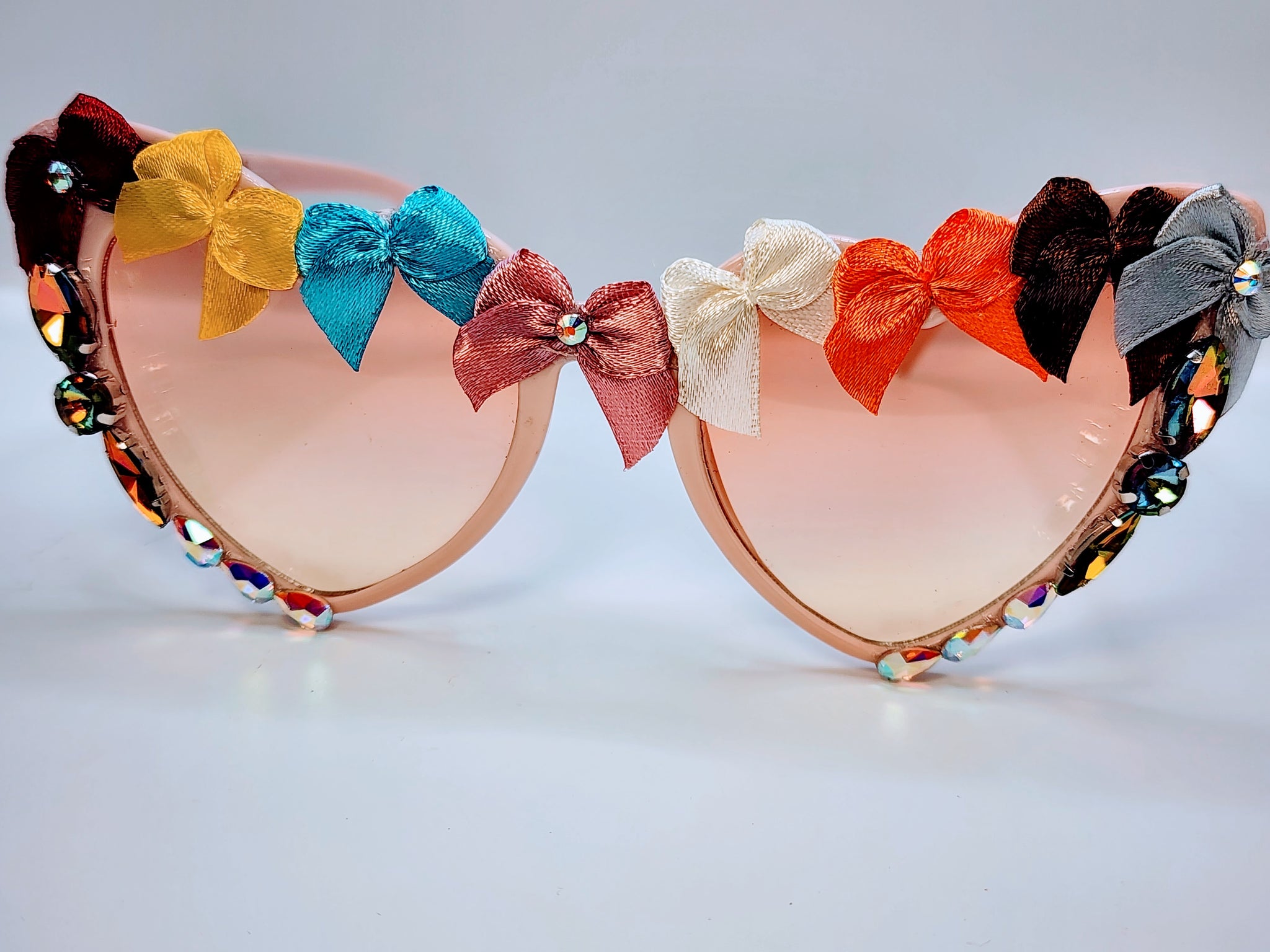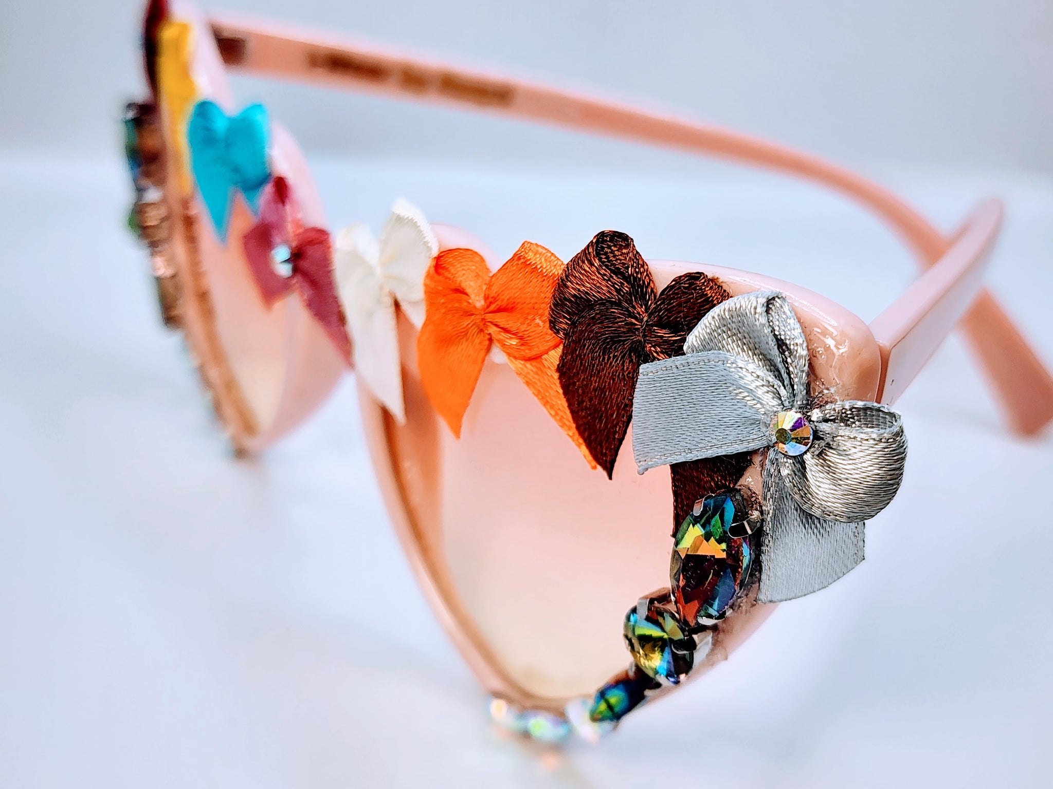 Catch Much Attention in these sweetheart 💗pink -heart-shaped glasses, delicately adorned with handcrafted satin ribbons strategically placed around the frame.